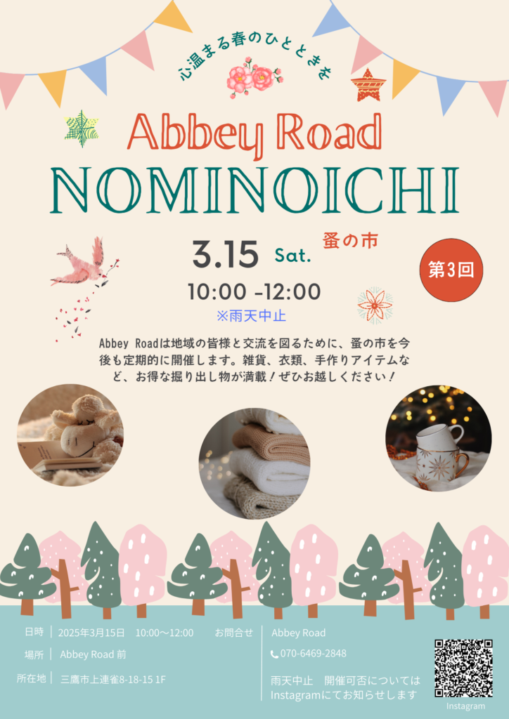 Abbey Roadは定期的に蚤の市を開催します♪第3回Abbey Road 「NOMINOICHI」の日程が決まりましたのでお知らせ致します。