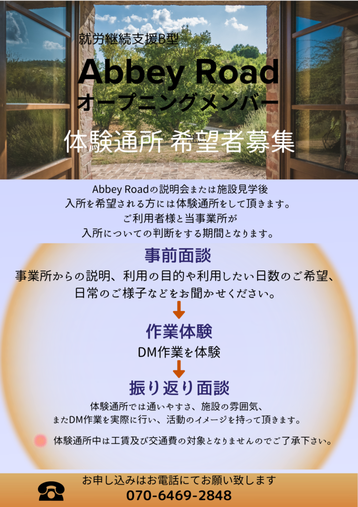 現在、Abbey Roadではオープニングメンバーを募集しています。詳細は以下のチラシをご覧下さい。